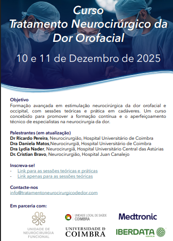 O Curso de Tratamento Neurocirúrgico da Dor aborda de forma integrada as estratégias modernas de intervenção na dor orofacial e occipital, desde a seleção de doentes até às técnicas cirúrgicas avançadas. O programa combina sessões teóricas com especialistas nacionais e internacionais e sessões práticas em cadáveres, proporcionando uma formação completa e orientada para a prática clínica.